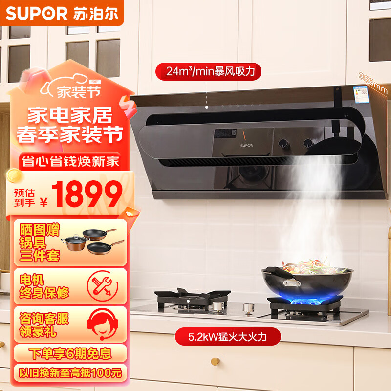 苏泊尔(SUPOR)抽油烟机 24m3/min大吸力 变频侧吸式脱排抽吸油烟机家用 挥手智控免拆洗烟灶套装 DJ50S+DS37液价格:1899.00元!