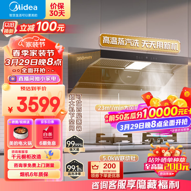 美的(Midea)抽油烟机 家用厨房顶侧双吸23吸力蒸汽洗 排油烟机烟灶联动套装DF5+Q523L天然气价格:3599.00元!