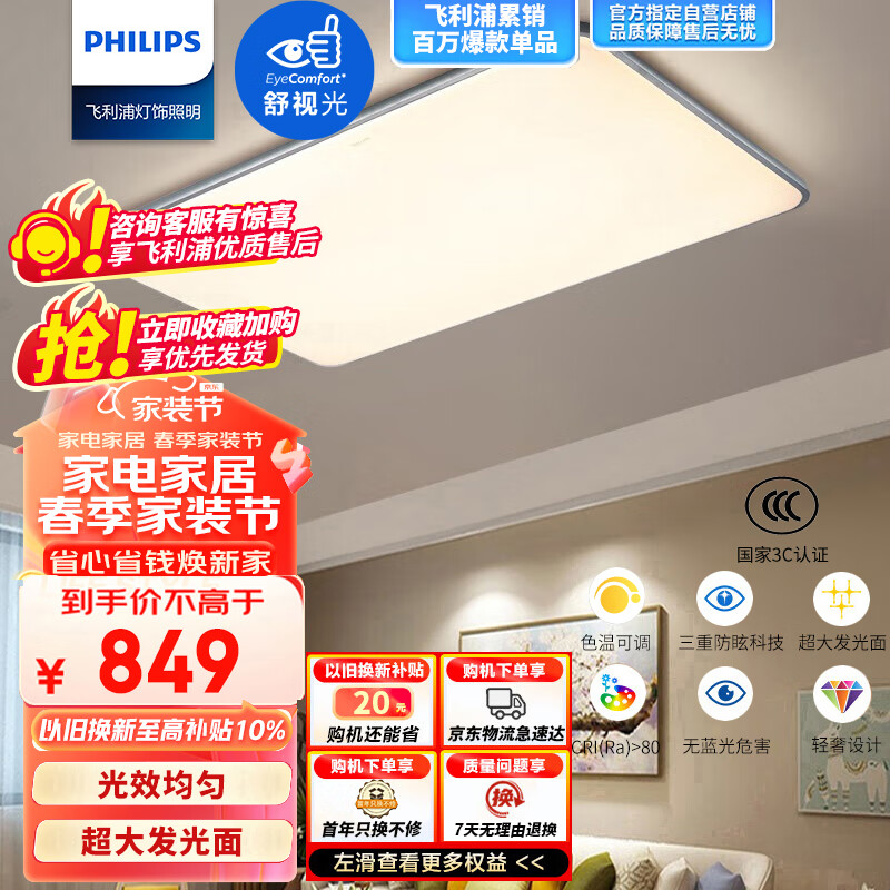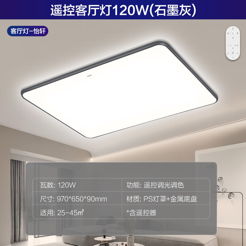 飞利浦LED吸顶灯客厅灯北欧风现代简约客厅卧室 怡轩灰120W价格:1249.00元!