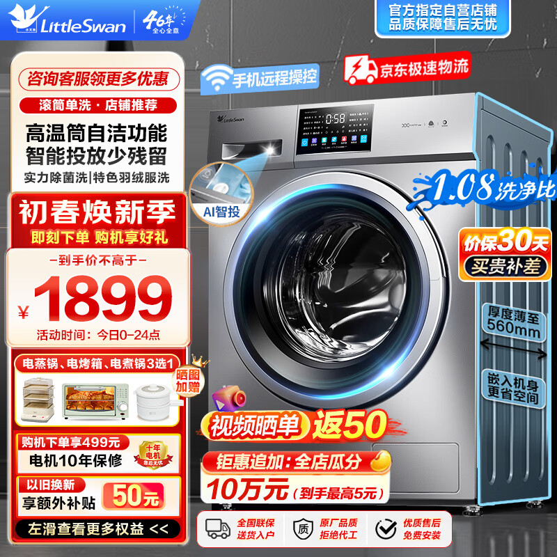 小天鹅(LittleSwan)滚筒洗衣机超薄全自动10公斤大容量 智能投放高温除菌筒自洁 母婴洗衣机 TG100V23WIDY 以旧换新价格:1899.00元!