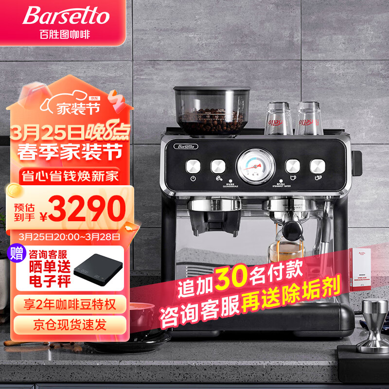 Barsetto二代咖啡机 百胜图意式半自动家用办公室研磨一体机 现磨咖啡豆手动奶泡机 双加热双泵BAE02石墨黑价格:3290.00元!