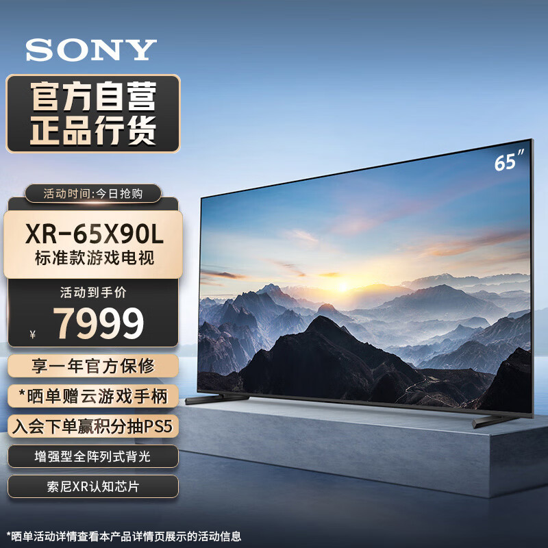 索尼(SONY)【官方直营】XR-65X90L 65英寸 屏4K超高清HDR 游戏电视 XR认知芯片 4K/120fps 京配上门价格:7999.00元!