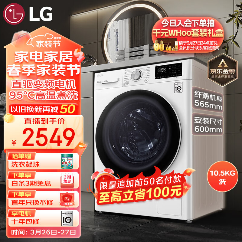 LG 纤慧系列 10.5KG全自动滚筒洗衣机家用 95℃高温煮洗 565mm超薄机身 智能手洗 白色FLX10N4W价格:2649.00元!