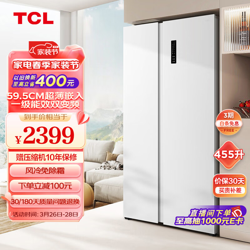 TCL 455升V7对开双开门超薄大容量白色冰箱 59.5cm超薄可嵌入 风冷无霜 一级能效 家用电冰箱R455V7-S价格:2499.00元!