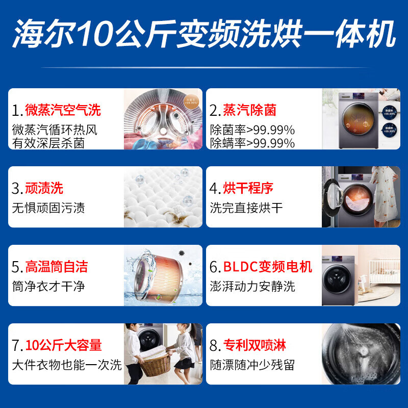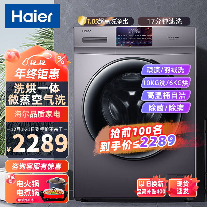 海尔(Haier)10公斤全自动滚筒洗衣机变频洗烘一体家用大容量空气洗高温筒自洁羽绒洗纤薄晶彩屏一级能效价格:2289.00元!