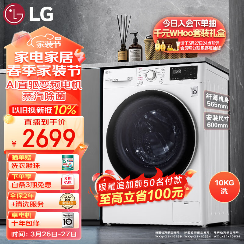 LG纤慧系列升级款 10KG超薄全自动滚筒洗衣机家用 蒸汽除菌 565mm超薄机身 14分钟快洗 白色FCY10Y4W价格:2799.00元!
