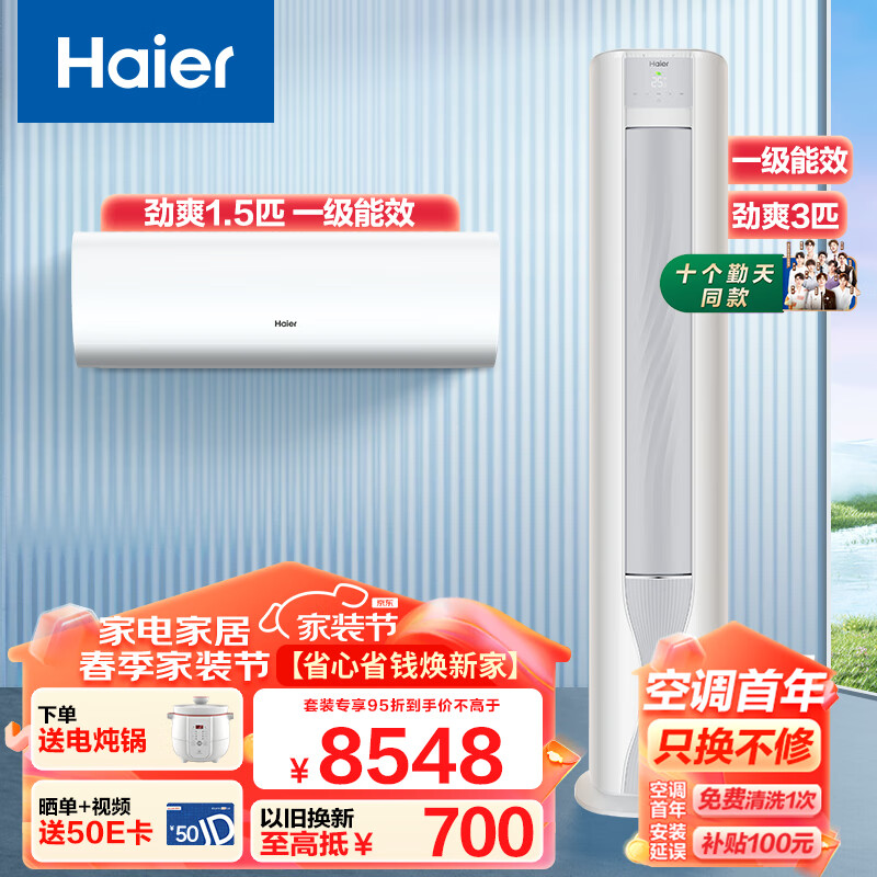 海尔(Haier)劲爽系列 冷媒变流 新一级变频冷暖空调 一室一厅空调套装 (1.5匹挂机+3匹柜机) 以旧换新价格:8548.00元!
