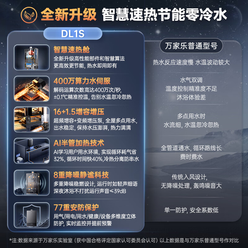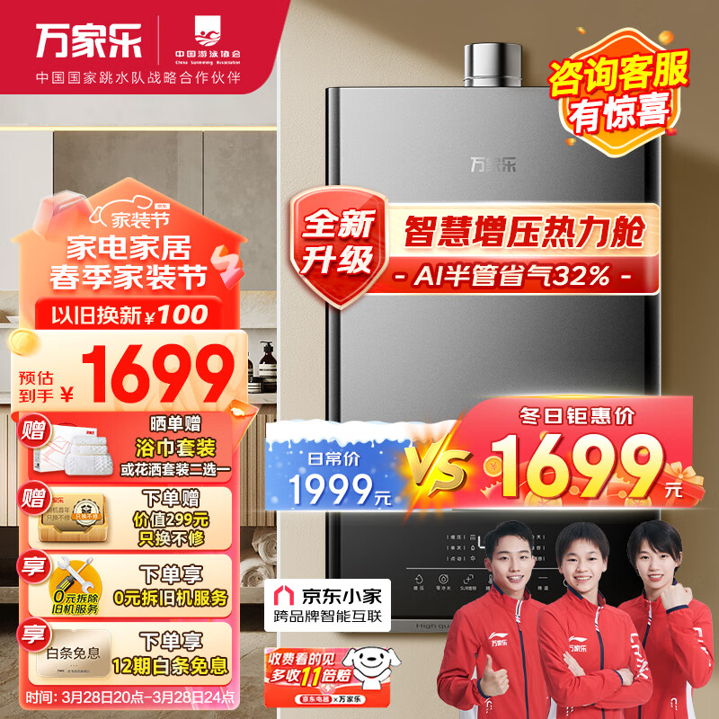 万家乐16升零冷水燃气热水器水气双伺服恒温APP智控智慧热力舱降噪天然气增压JSQ30-16DL1S京东小家价格:1699.00元!