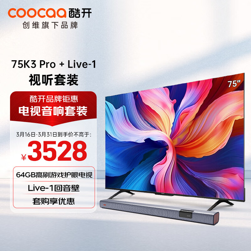 酷开创维 75英寸K3 Pro电视机+音响Live-1 回音壁 客厅家庭影院 壁挂条形音箱 蓝牙影院级娱乐体验套装价格:3528.00元!