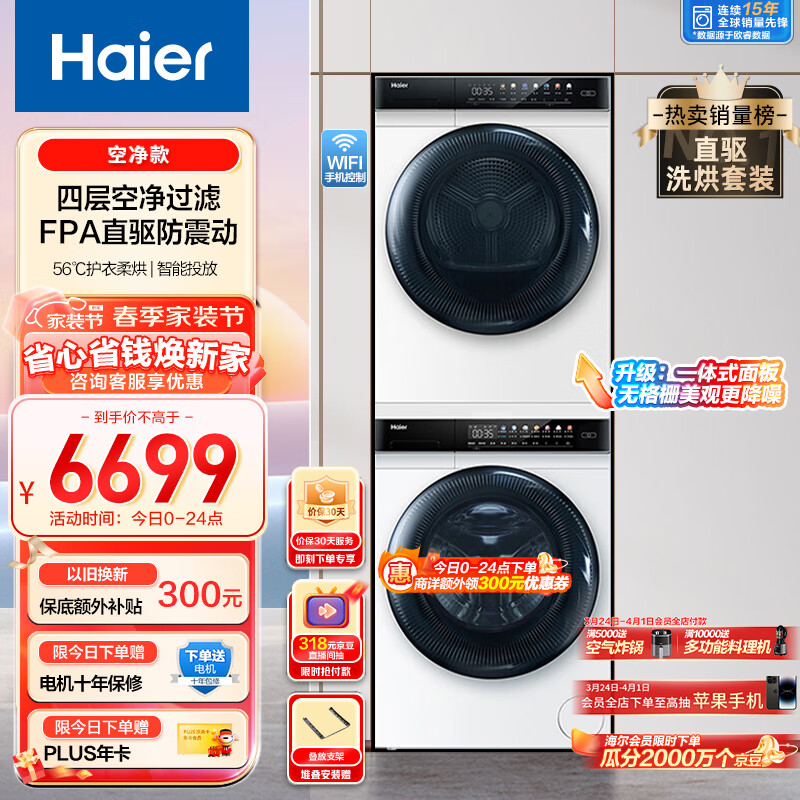 海尔(Haier)白色洗烘套装 10KG直驱滚筒洗衣机+热泵烘干机家用 智投 锶泉亲肤洗 负离子空气洗 MATE7W+7W价格:6999.00元!