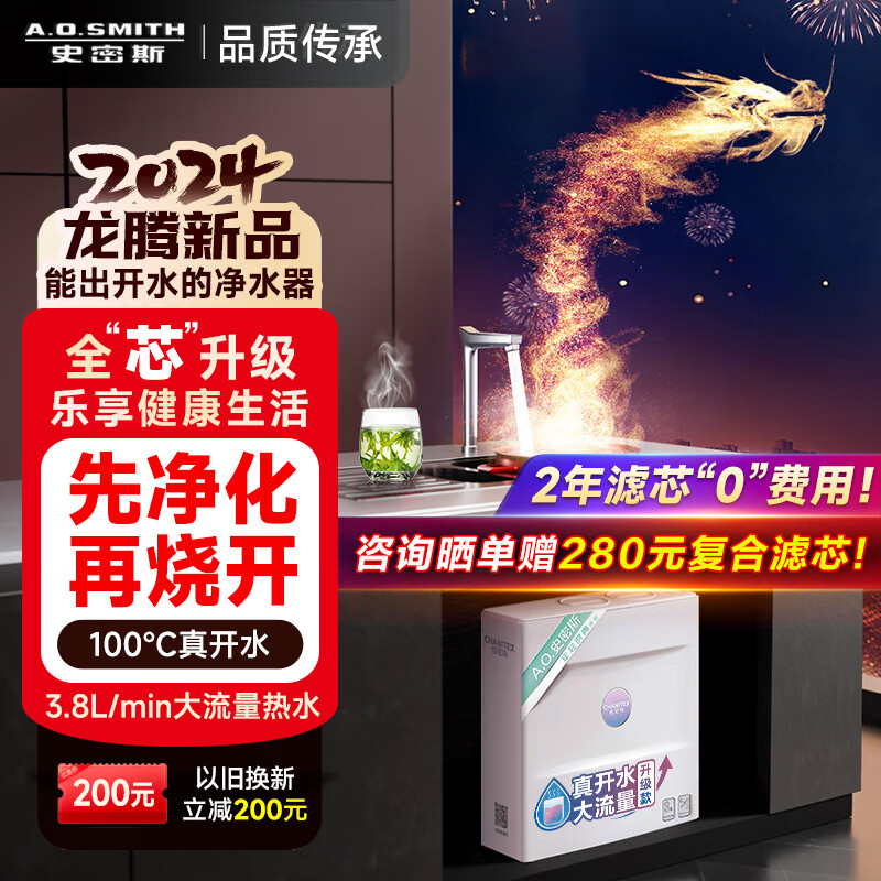 史密斯(A.O.SMITH)佳尼特【龙腾上新】加热净水器厨下家用净水机3.8升/分钟多档控温0陈水CDR2000F【FA1升级款】价格:4699.00元!