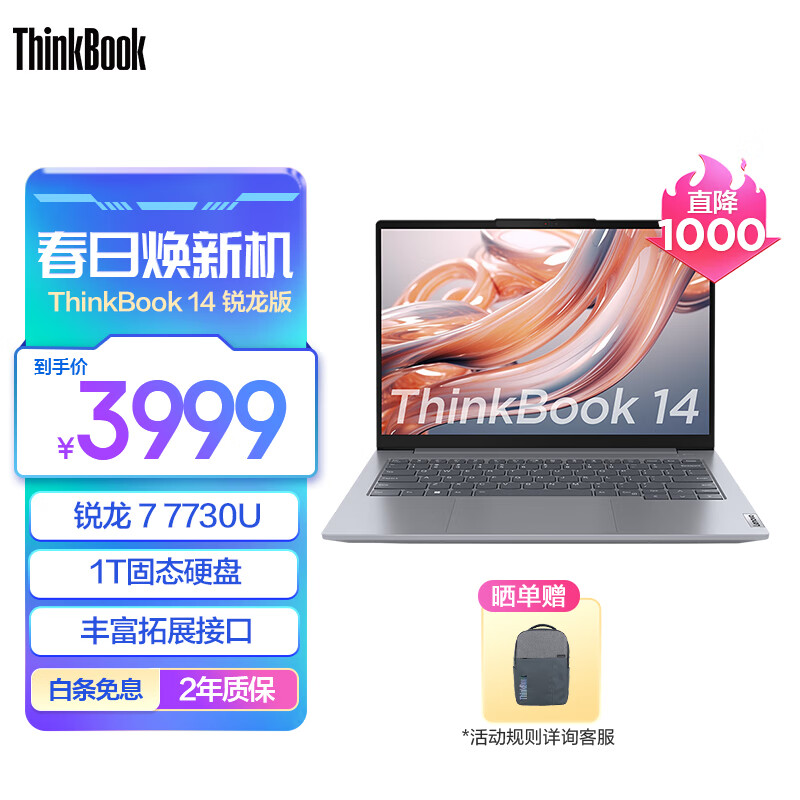 ThinkPad联想ThinkBook 14/16锐龙版 商务轻薄笔记本电脑 14英寸:R7-7730U 16G 1T 24CD价格:4999.00元!