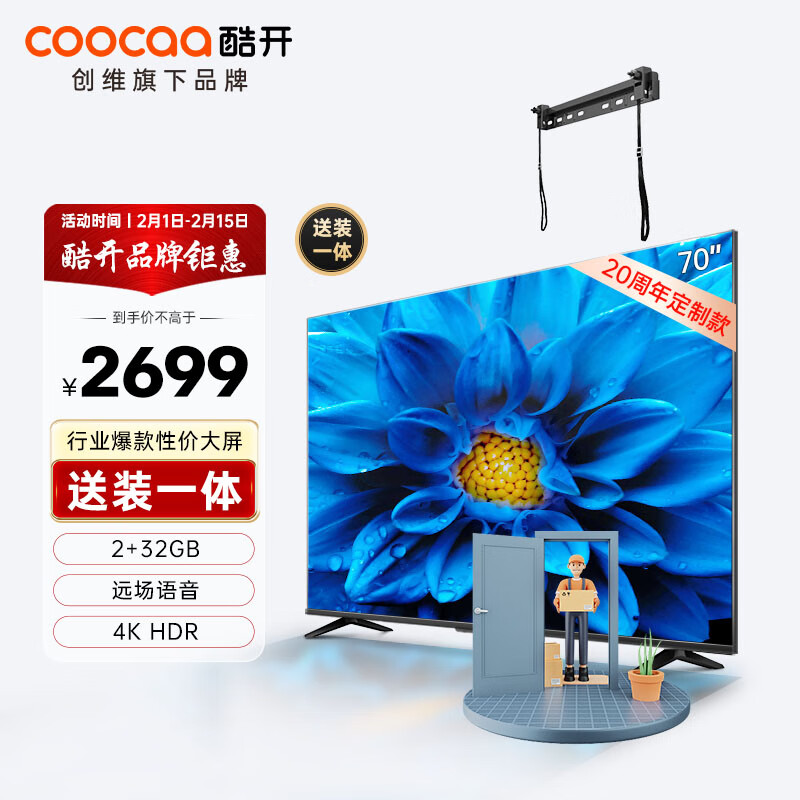 酷开创维J3 70英寸电视 送装一体 4K超清2+32G大内存 远场语音声控 无频闪金属屏 平板电视机70J3价格:2499.00元!