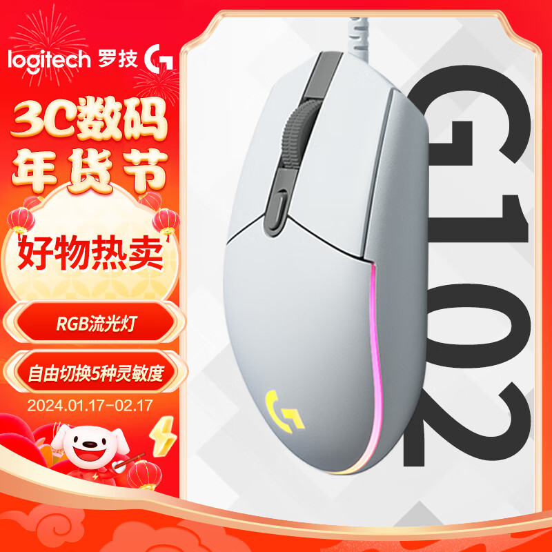 罗技(G)G102 游戏鼠标 白色 RGB鼠标 吃鸡鼠标 绝地求生 轻量化设计 200-8000DPI G102第二代价格:99.00元!