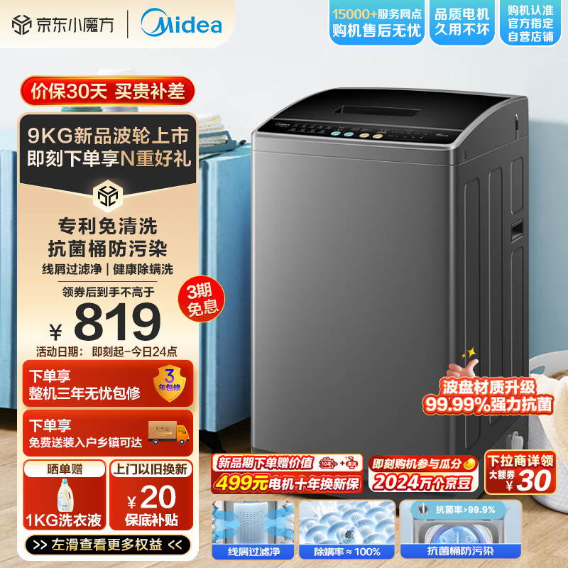 美的(Midea)全自动波轮洗衣机家用 9公斤 抗菌除螨 镀锌钢板 20年防生锈 宿舍租房神器 MB90V30E价格:849.00元!