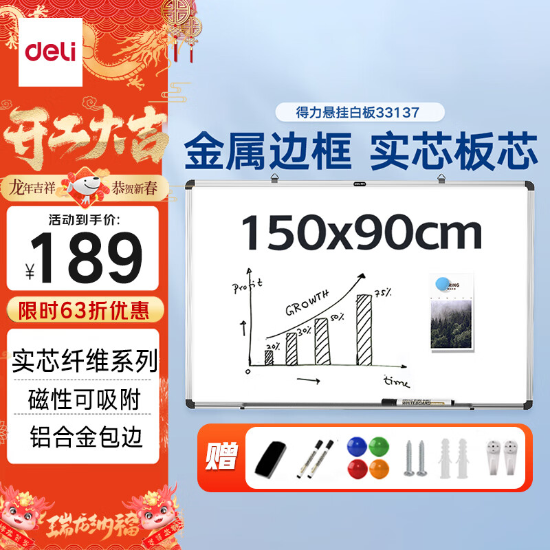 得力150*90cm实心纤维板芯白板 易擦磁性挂式白板悬挂写字板白板黑板(含白板擦 白板笔 磁钉)33137价格:189.00元!