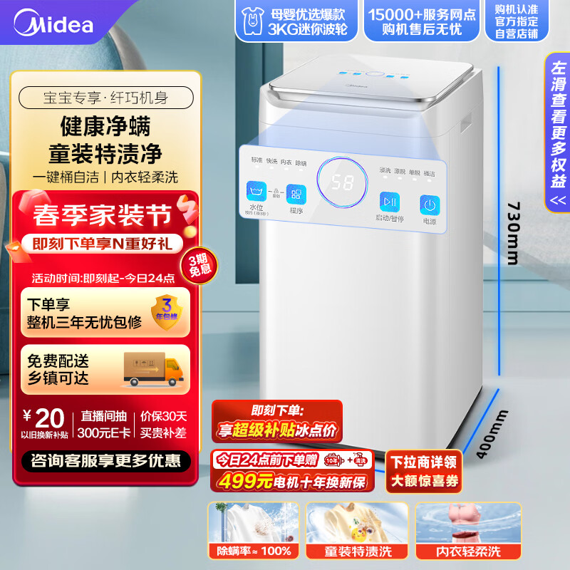 美的(Midea)波轮洗衣机全自动 MB30V10E 3公斤 迷你洗衣机小型 儿童洗衣机 婴儿洗衣机 内衣洗衣机 除螨价格:649.00元!