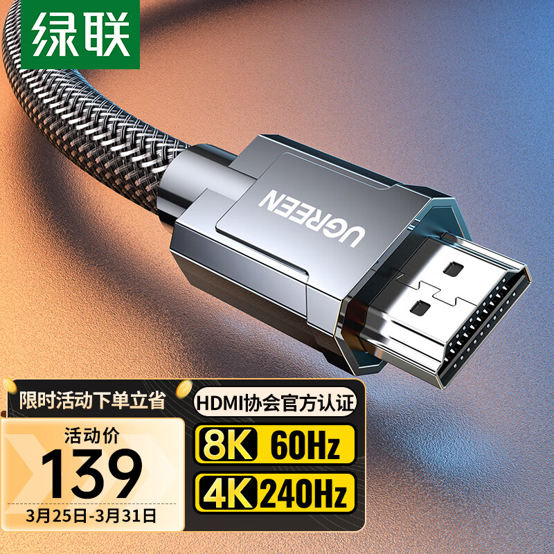 绿联HDMI线2.1版8K60Hz 4K240Hz高清视频连接线兼容HDMI2.0笔记本电脑机顶盒接电视显示器投影仪3米价格:139.00元!