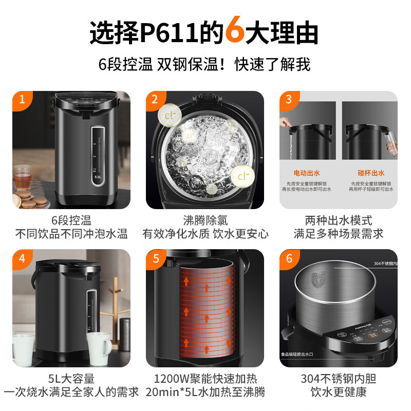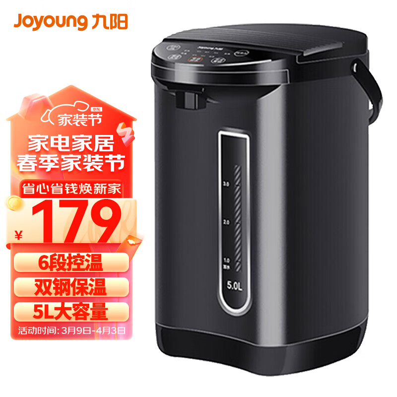 九阳(Joyoung)电热水瓶热水壶 5L大容量六段保温304不锈钢 恒温水壶 家用电水壶烧水壶 K50-P611价格:179.00元!