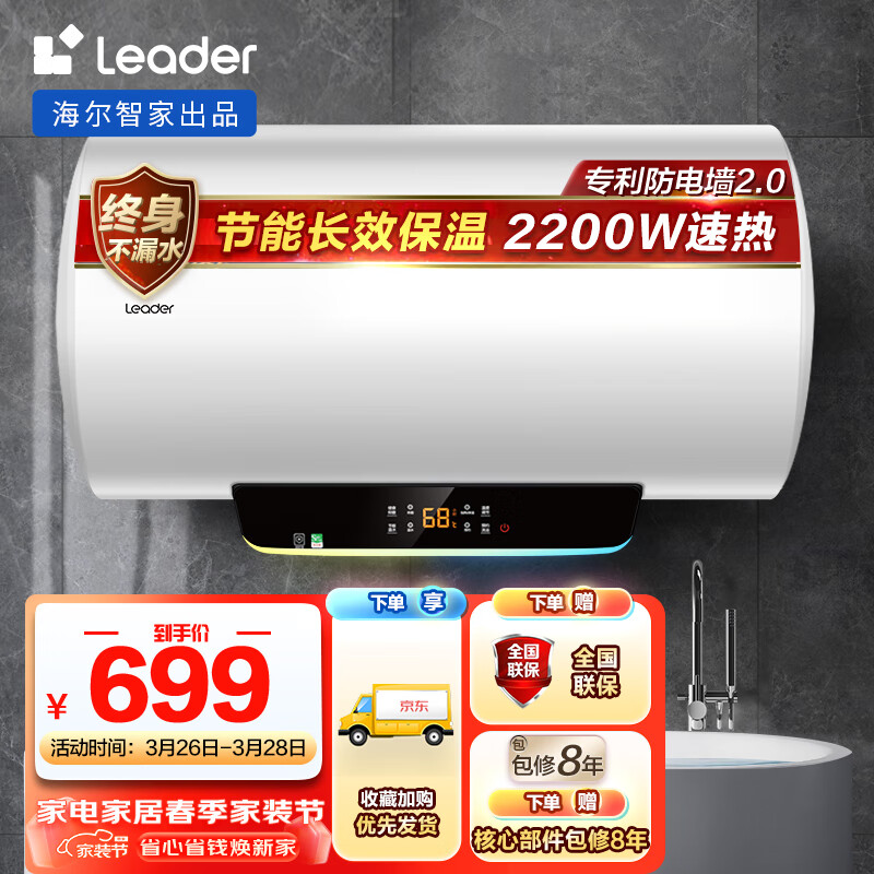 海尔智家出品Leader 60升电热水器家用洗澡储水式 安心浴系列 小尺寸易安装节能 LES60H-LT价格:699.00元!