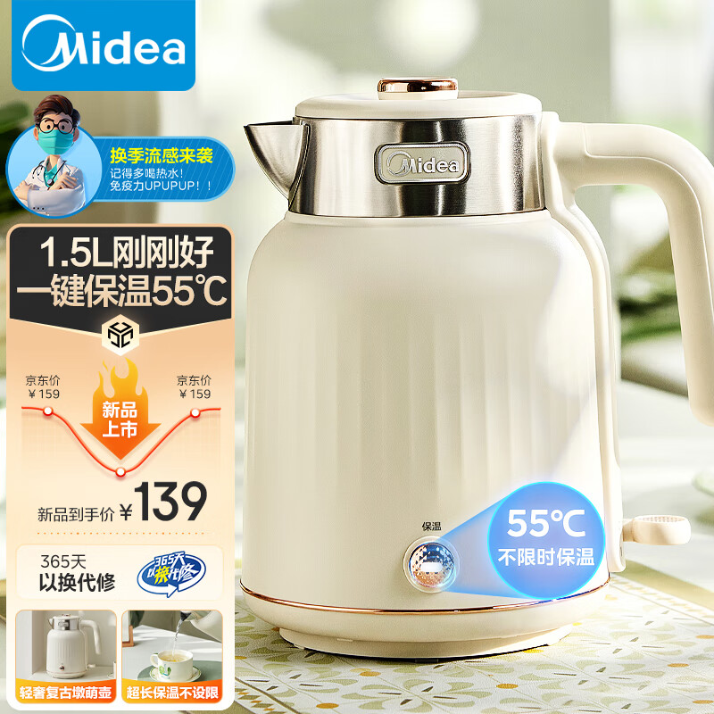 美的(Midea)电水壶烧水壶 热水壶电热水壶 一键保温恒温开水壶304不锈钢 1.5L大容量双层防烫无缝内胆SH51-Q价格:139.00元!