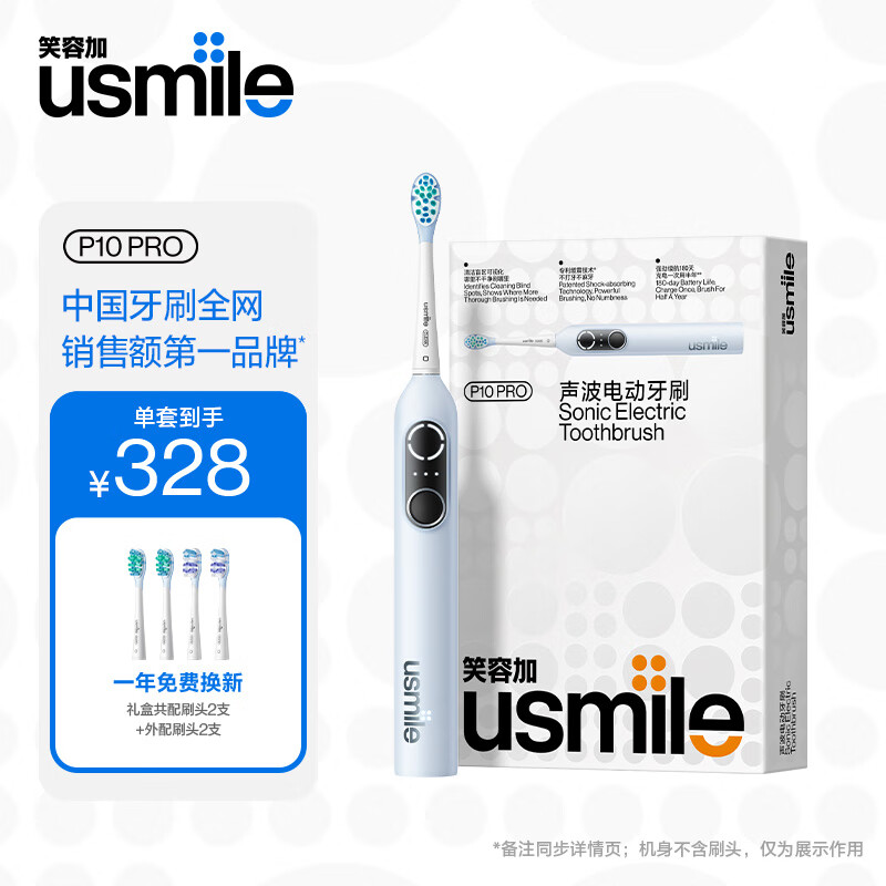 usmile笑容加 成人电动牙刷 P10PRO云青蓝+缓震亮白刷头2支装价格:398.00元!