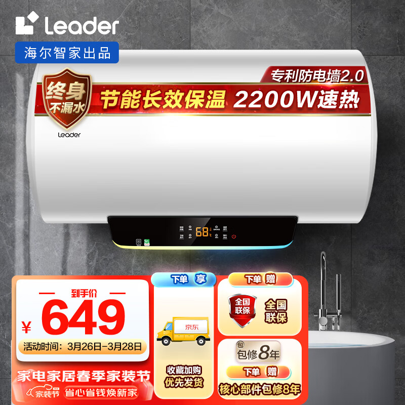 海尔智家出品Leader系列 50升电热水器家用 安心浴系列 小尺寸易安装节能 LES50H-LT价格:649.00元!