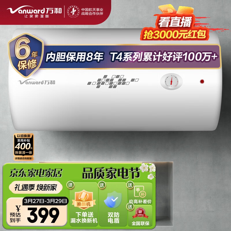 万和(Vanward)40升电热水器双防电盾 双重防护 温显型洗澡机E40-T4-22价格:399.00元!