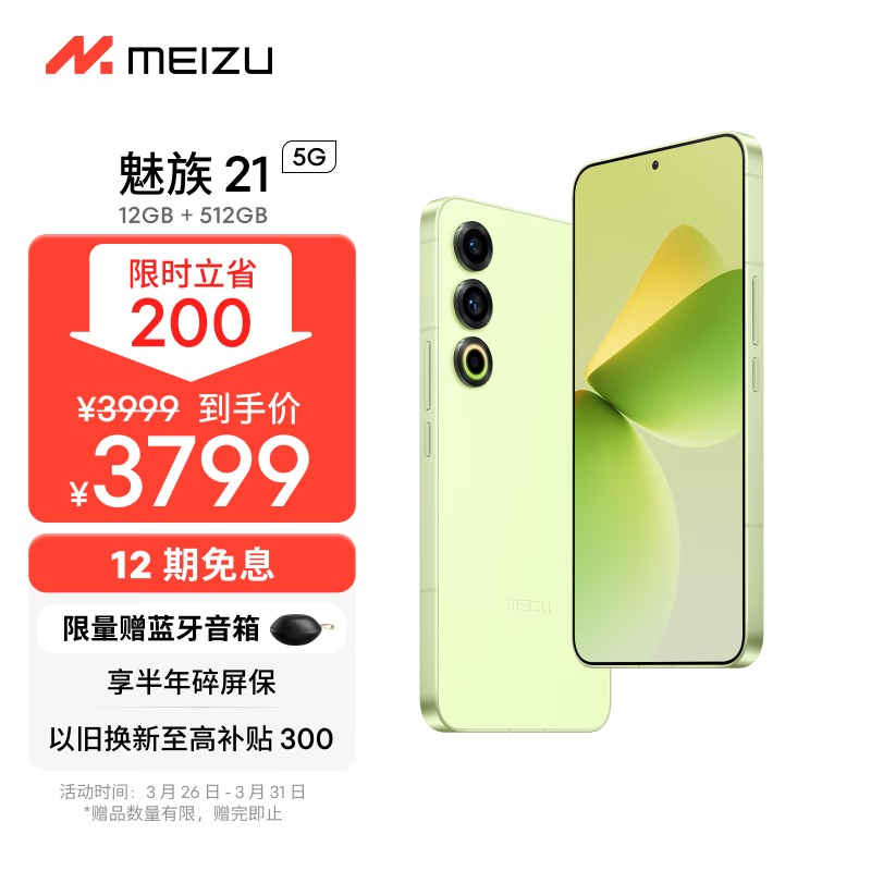 魅族(MEIZU)21 12GB+512GB 锐意青 1.74mm极窄四等边直屏 骁龙8Gen3 2亿像素 80W超充 5G游戏学生拍照手机价格:3799.00元!