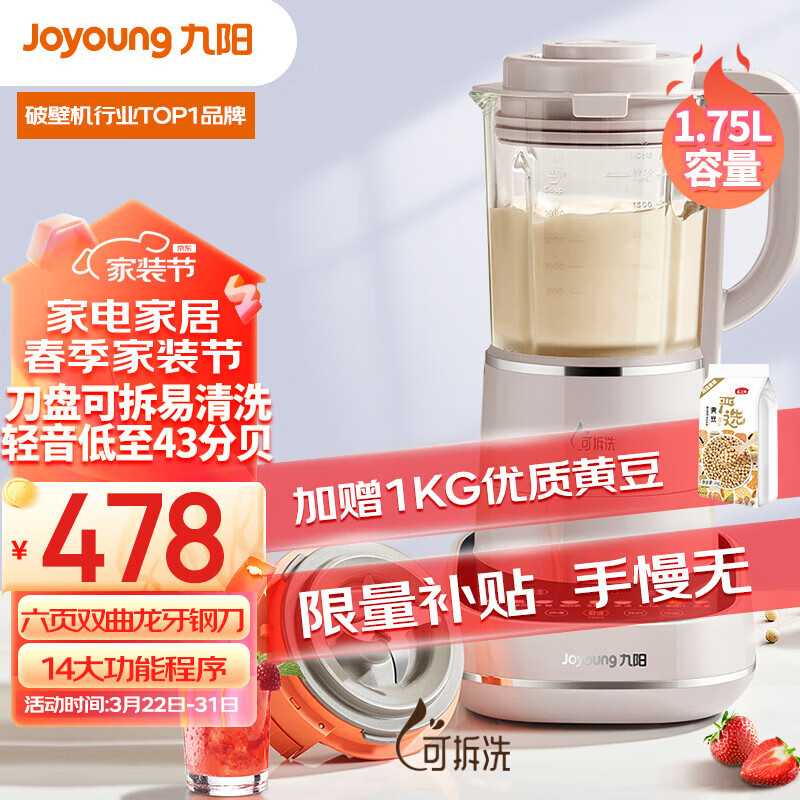 九阳轻音破壁机 可拆易清洗 家用榨汁机 豆浆机 多重降噪 高温清洗 热烘除菌 破壁机L18-P660价格:478.00元!