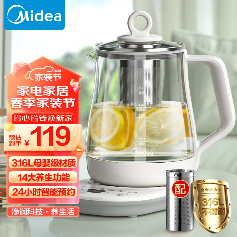 美的(Midea)养生壶 316L不锈钢1.5L煮茶壶 24小时预约烧水壶 12小时恒温 11档控温 电热水壶 MK-Y12Q-316价格:119.00元!