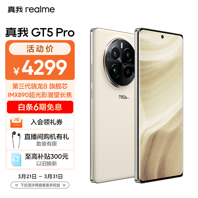 realme真我GT5 Pro第三代骁龙8旗舰芯 IMX890潜望长焦 4500nit无双屏 5G游戏AI手机 16GB+1TB皓月价格:4299.00元!