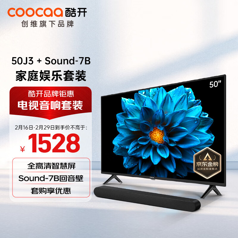 酷开创维J3 50英寸电视 超高清智慧屏电视机+Sound-7B木制回音壁 家庭影院KTV 立体环绕DSP数字音响价格:1528.00元!