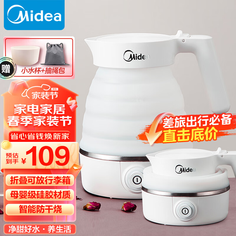 美的(Midea)便携式烧水壶电水壶折叠水壶电热水壶迷你便携旅行出差食品级硅胶智能防干烧开水壶SH06Simple101价格:109.00元!