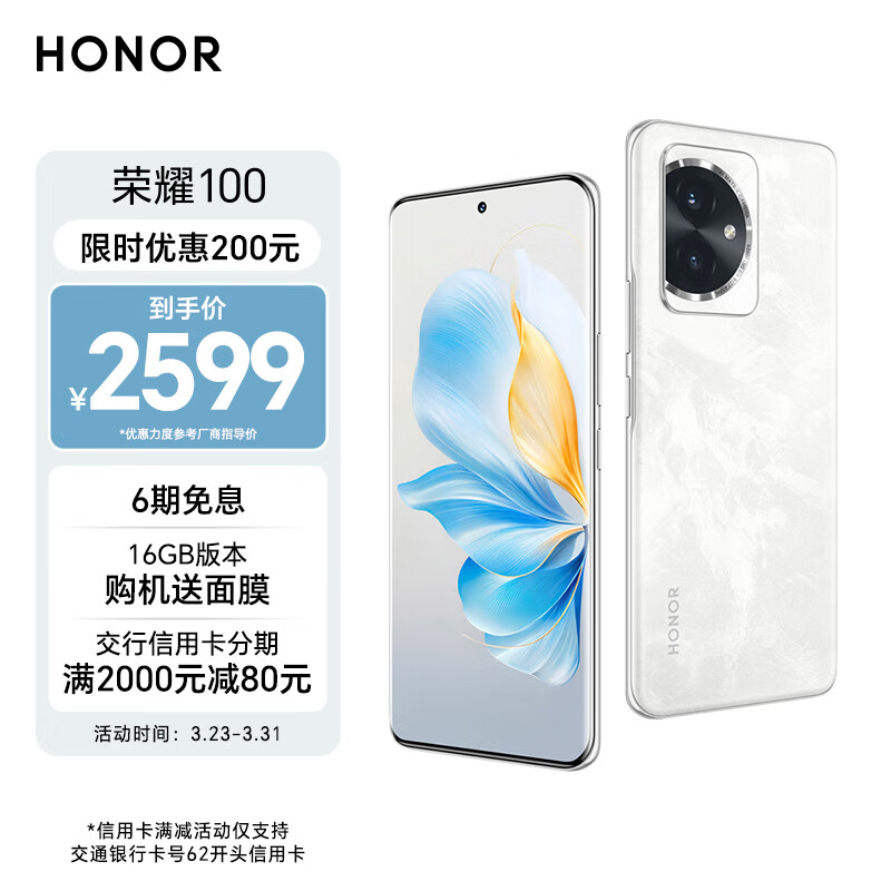荣耀100 单反级主摄 荣耀绿洲护眼屏 第三代骁龙7 立体声双扬声器 OIS光学防抖 16+256 月影白 5G价格:2799.00元!