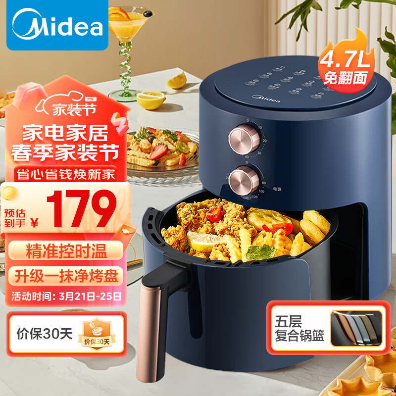 美的(Midea)空气炸锅 免翻面 家用大容量 4.7L 炸烤箱一体 精准控温 不沾易洗 不用翻面 KZE5054价格:179.00元!