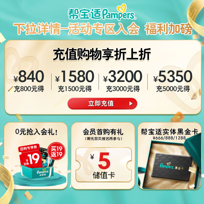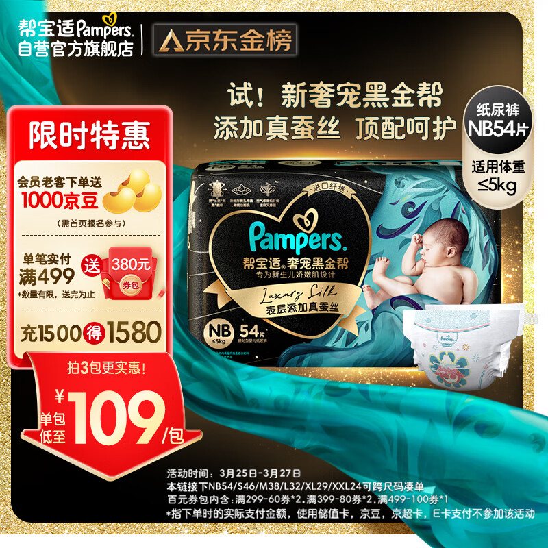 帮宝适黑金帮纸尿裤NB54片(≤5kg) 尿裤尿不湿新生儿 婴儿蚕丝超薄透气价格:128.20元!