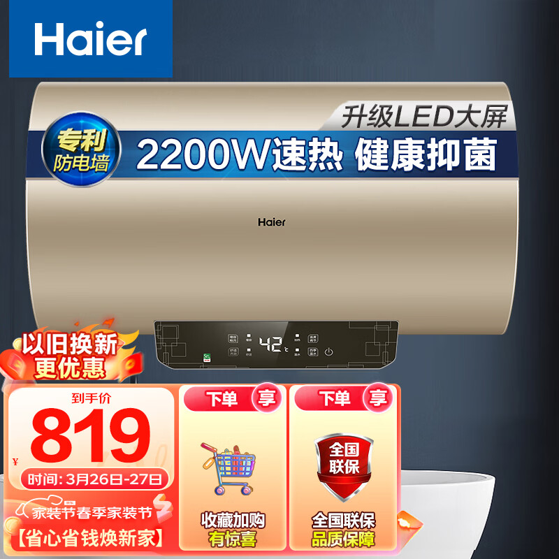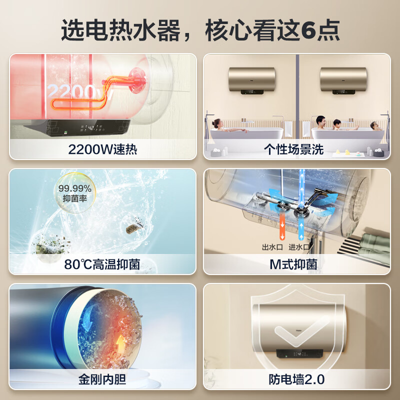海尔(Haier)60升电热水器家用储水式 2200W节能高效加热增容出租房 大水量金刚搪瓷内胆 2.0防电墙 EC6001-TF3价格:1019.00元!