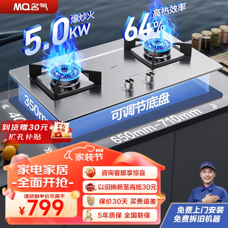 名气(MQ)老板燃气灶天然气嵌入式 家用5.0KW大火力猛火灶 煤气灶双灶 可调节底盘 不锈钢灶具 JZT-A6510G价格:799.00元!