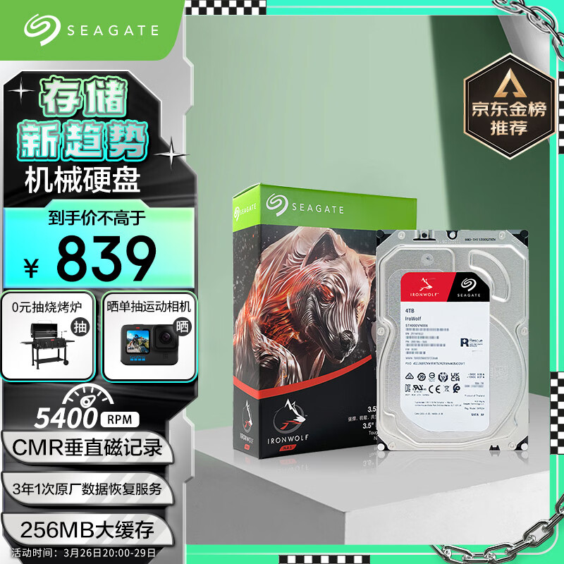 希捷(SEAGATE)NAS硬盘 4TB 256MB 5400转 CMR垂直 网络存储 SATA 希捷酷狼 机械硬盘 数据恢复服务 3.5英寸价格:839.00元!
