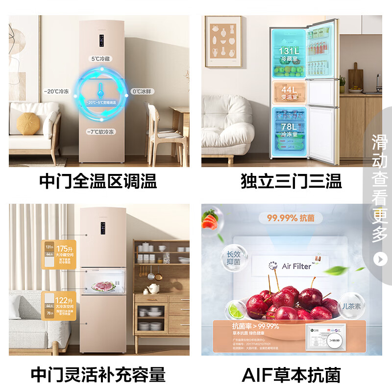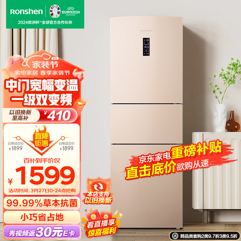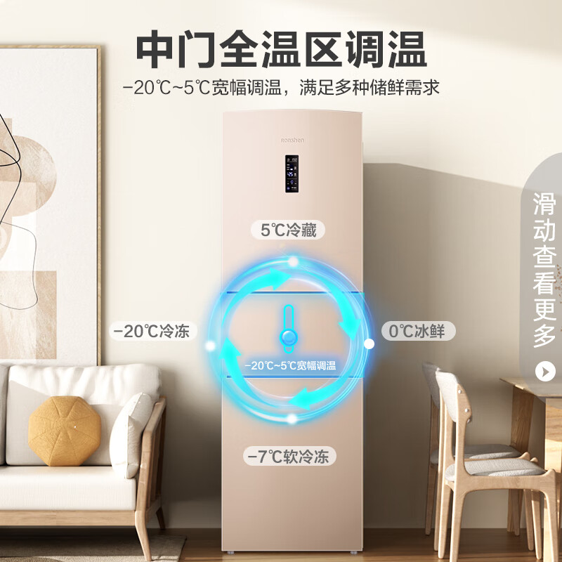 容声(Ronshen)253升变频一级能效三开门小冰箱家用小型风冷无霜不占地BCD-253WD16NPA中门宽幅变温价格:1599.00元!
