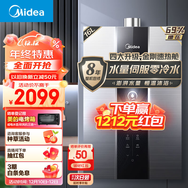 美的(Midea)16升燃气热水器天然气 循环增压零冷水 智控水伺服 家用智能恒温 5重净水 家用节能 JSQ30-MK9耀界价格:2099.00元!