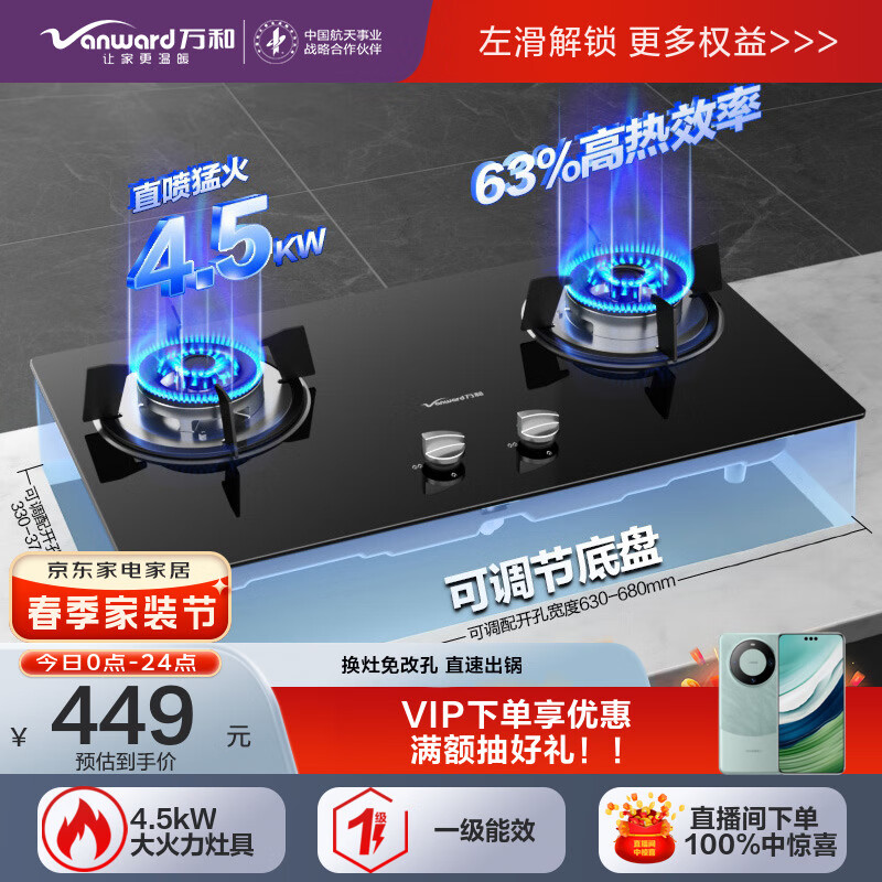 万和(Vanward)燃气灶4.5KW大火力 家用台式嵌入式两用 燃气灶具 双眼灶 63%热效率 JZT-B5L30(天然气)价格:449.00元!