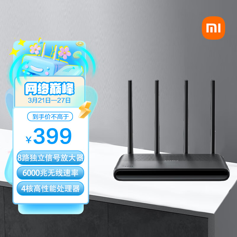 小米(MI)Redmi 路由器 AX6000 2.0GHz四核高性能CPU 8条流Wi-Fi6路由+8颗外置信号放大器 电竞级游戏加速价格:379.00元!