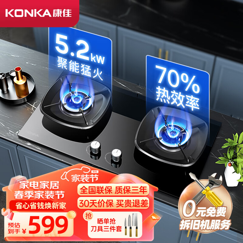 康佳(KONKA)燃气灶双灶具 5.2kW猛火灶 70%热效率 黑晶面板聚能炉架 台式/嵌入式 JZT-B520YG(天然气)价格:599.00元!