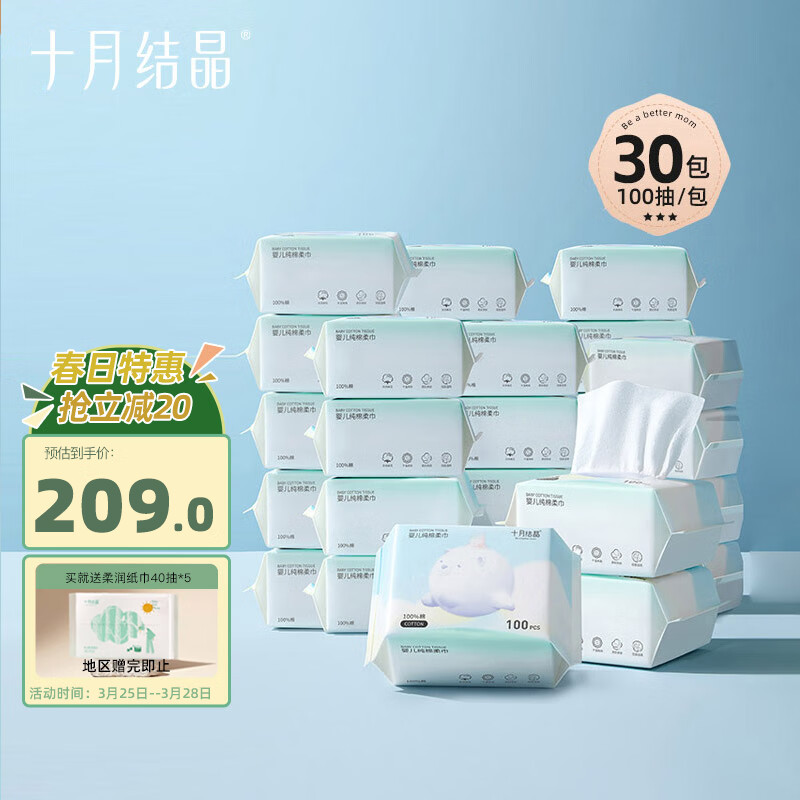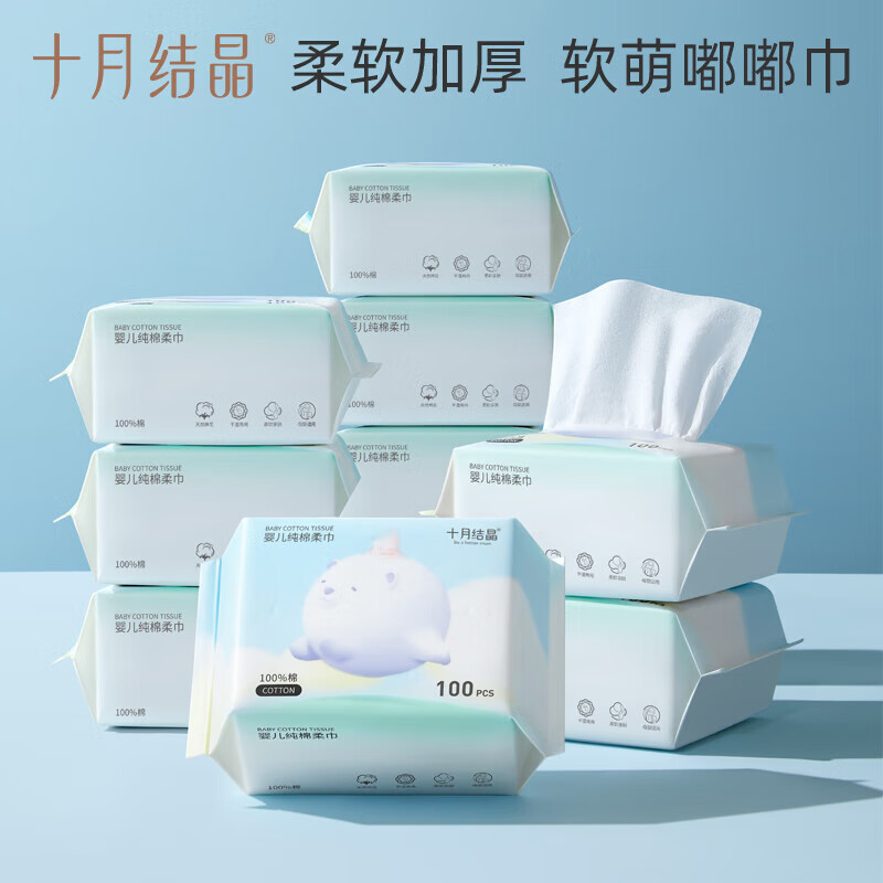 十月结晶婴儿棉柔巾宝宝干湿两用巾纯棉纸巾一次性洗脸巾100抽*30包价格:299.00元!