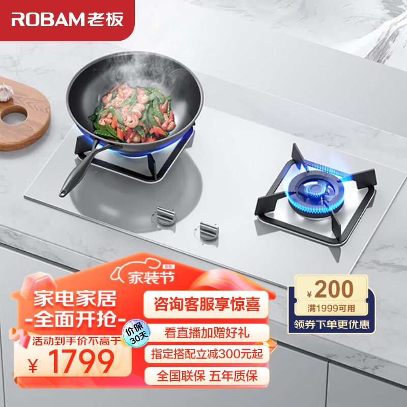 老板(Robam)燃气灶天然气灶双灶具 4.7kW易打理嵌入式灶具燃气灶台 网红素白钢化玻璃高效猛火灶家用JZT-32B8A价格:1799.00元!