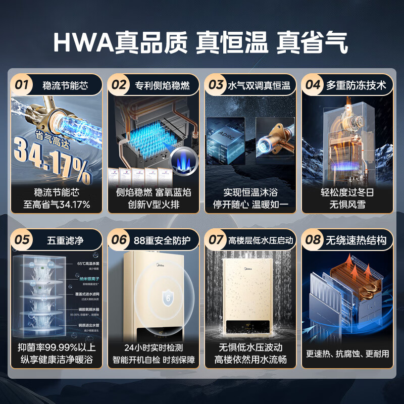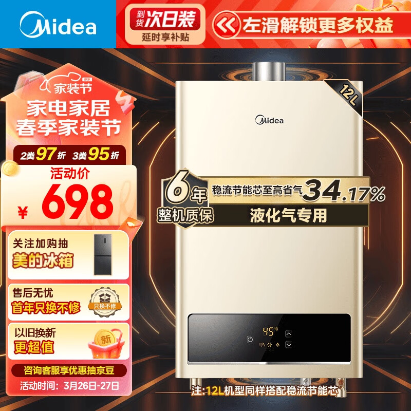 美的(Midea)12升液化气热水器 智能恒温 水气双调 低水压启动 多重安防 大屏显示 JSQ22-HWA(液)价格:698.00元!