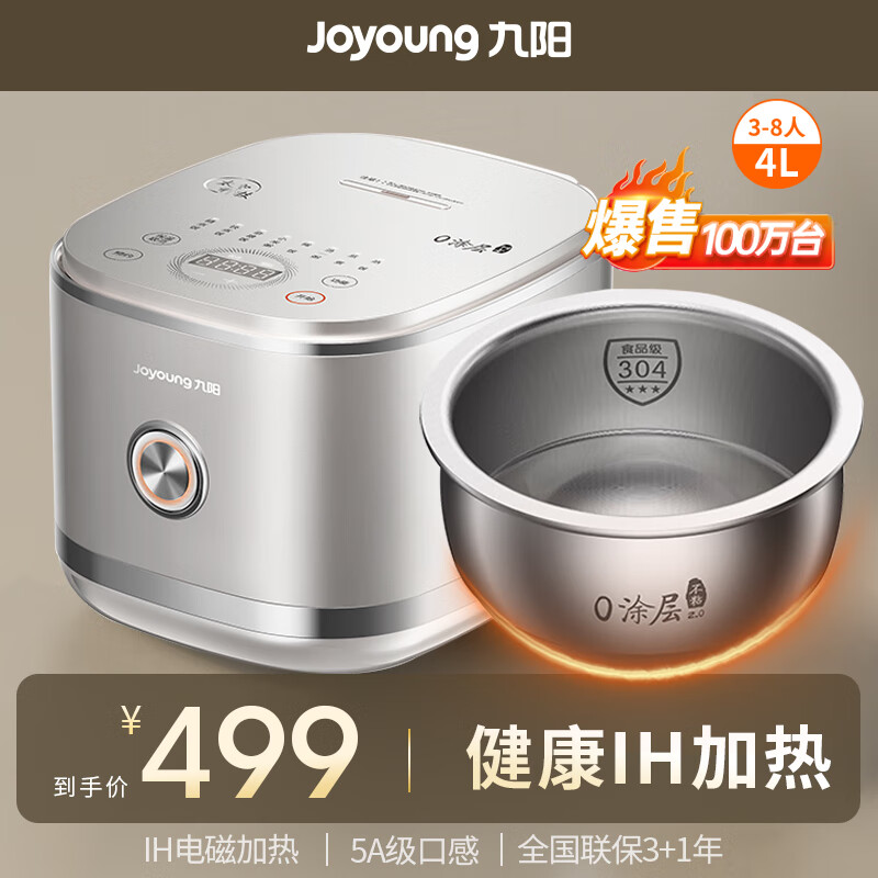 九阳(Joyoung)【0涂层】太空系列4L3-8人无涂层电饭煲电饭锅5A认证风冷水润膜不锈钢内胆1200WIH电磁加热4升40N1价格:599.00元!
