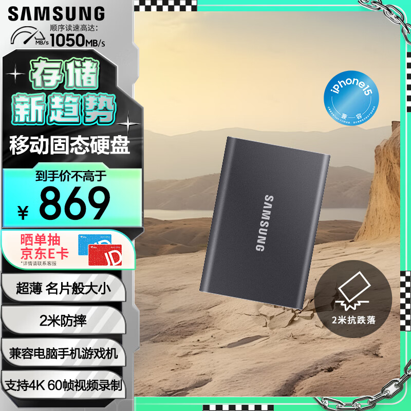 三星(SAMSUNG) 1TB Type-c USB 3.2 移动固态硬盘(PSSD) T7 灰色 NVMe传输速度1050MB/s 超薄时尚价格:869.00元!